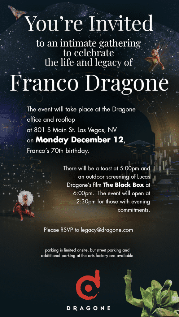 December 12, 2022, will be Franco Dragone’s 70th birthday. In his honor we will be gathering to remember and celebrate his life and legacy at the Dragone office in the Las Vegas Arts District.